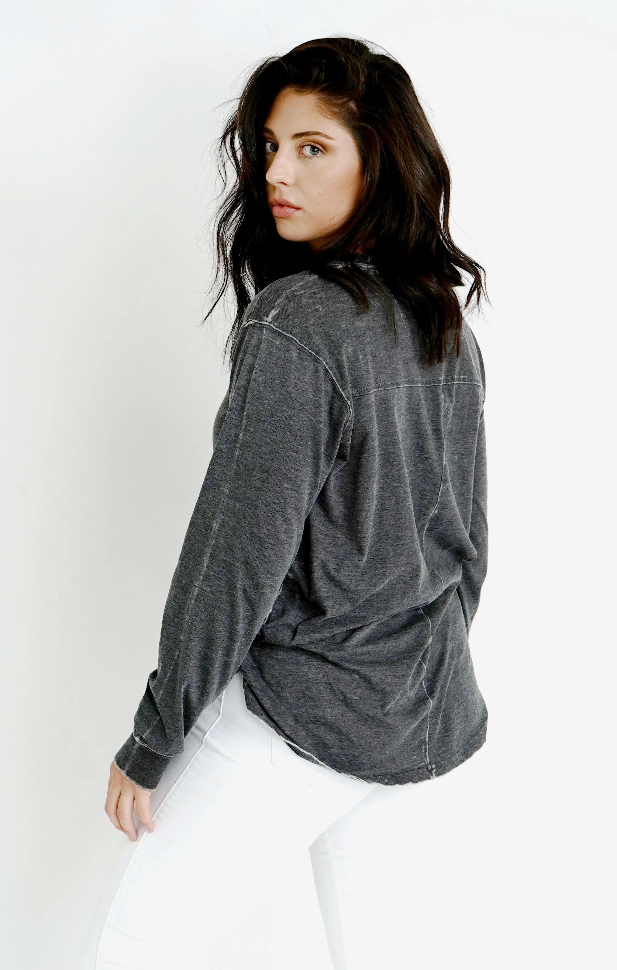 Our classic long sleeve tee with a relaxed fit and vintage wash that only gets better with time! Also notice the thumb holes! 52% Cotton, 48% Polyester.